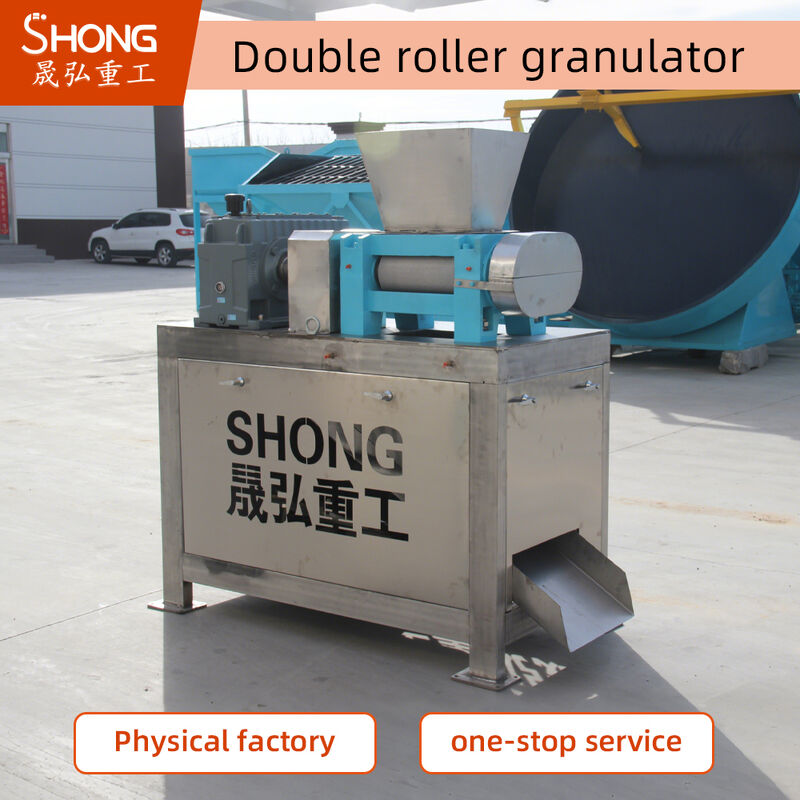 Compound fertilizer granulator, belong to the extrusion slip model, its working principle is: the motor drive the belt and pulley, transfer to the drive shaft through the speed reducer, through the open gear synchronously with the driven shaft, the double rollers rotate in the opposite direction. The raw material input through the feed hopper, and after the extrusion molding, demoulding granulating, through a chain transfer to crushing and screening, after separating , the finished granules come out, and the powder will be back to the mixer, for granulation again. With the continuous rotation of the motor, the continuous input of material, to achieve mass production.